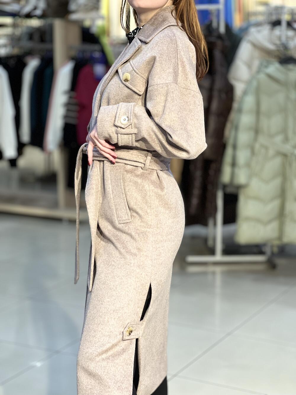 Пальто з вовною альпаки демісезон,форма-тренч,застібка на потаємні кнопки,спущене плече,в комплекті пасок,збоку глибокі розрізи.