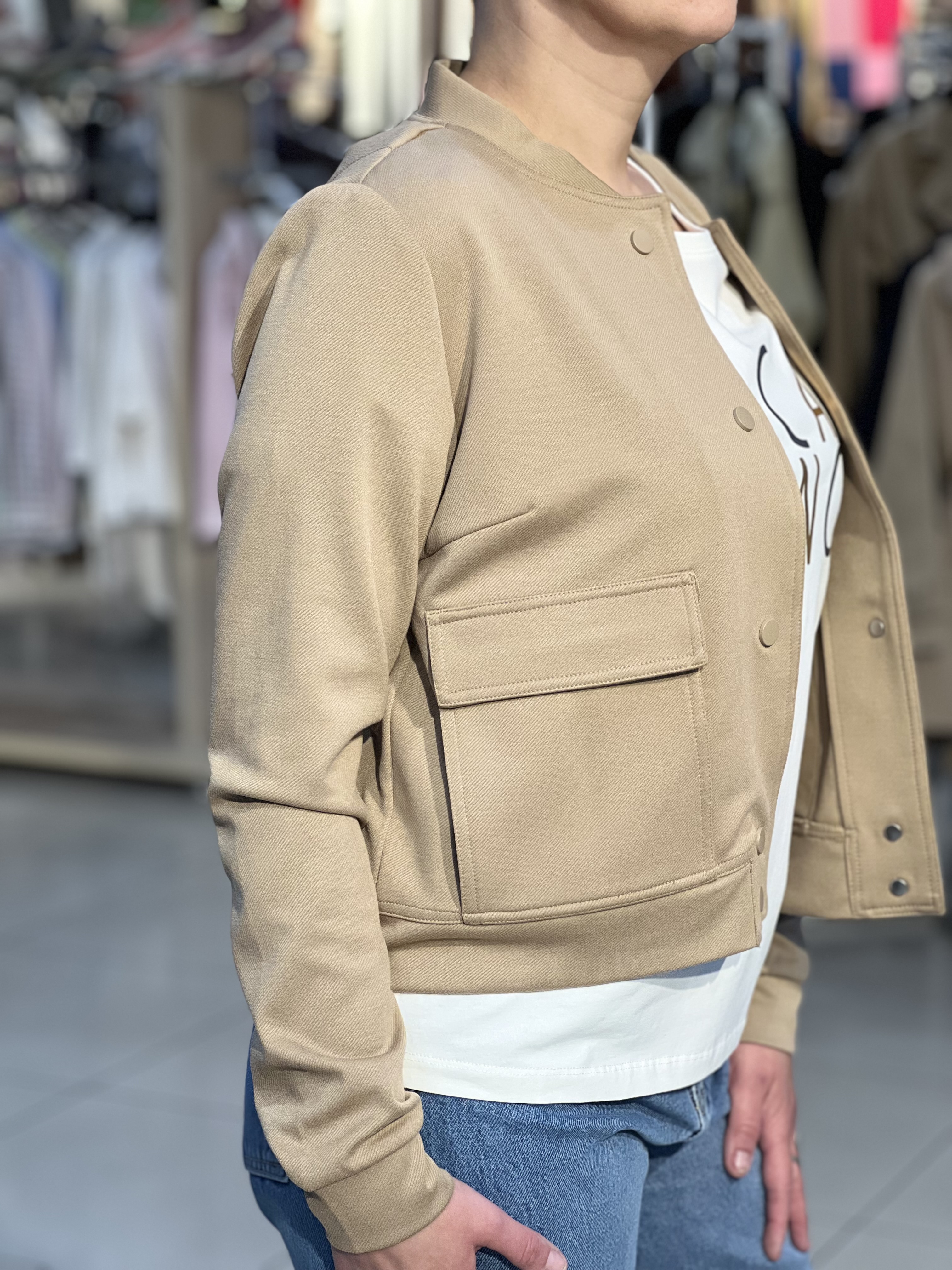 Бомбер короткий без підкладки,накладні кишені,застібка на кнопки,низ рукава на манжеті,горловина-стійка
